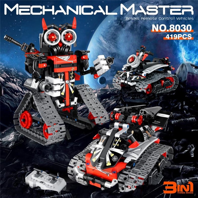 - Robot RC 3 en 1: 419 piezas para construir tres modelos distintos: un robot de combate con ametralladora, un tanque blindado con orugas y un vehÃculo acorazado con misiles laterales. Medidas ensamblado: 19 x 17 x 24 cm